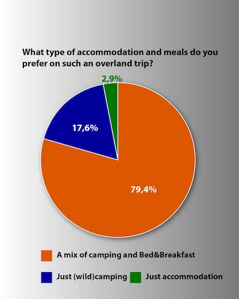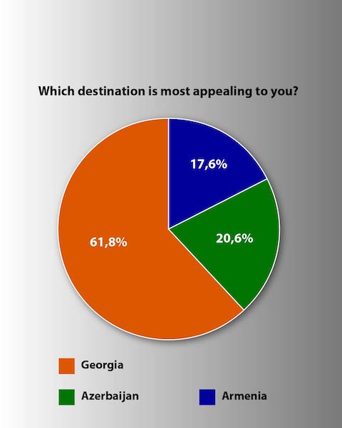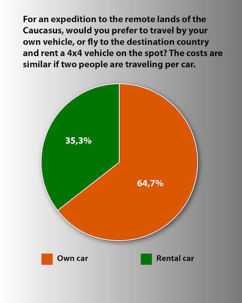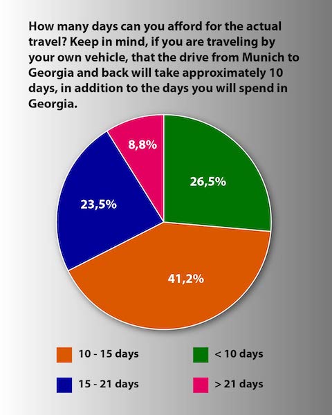 After about ten days, it's time to announce the survey results. 34 people participated in the survey, and the conclusion is as follows: The expedition will go to Georgia for two weeks, which does not include the travel time to Georgia and the travel time from Georgia. The trip will be made with personal vehicles, and it will be a combination of camping and accommodation.